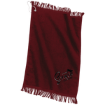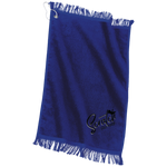 100% cotton terry velour Measures 11 in x 18 in Grommet and hook for convenience; Fringed for added accent Decoration type: Embroidery Made by Port & Co.®